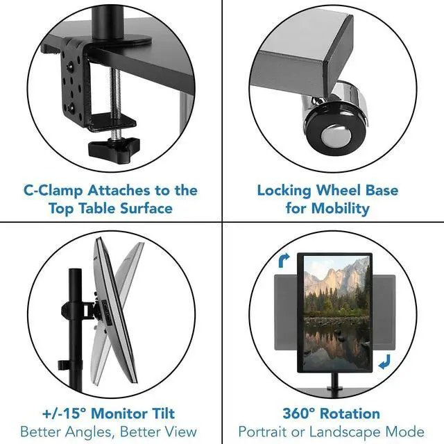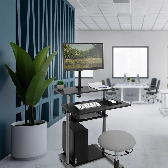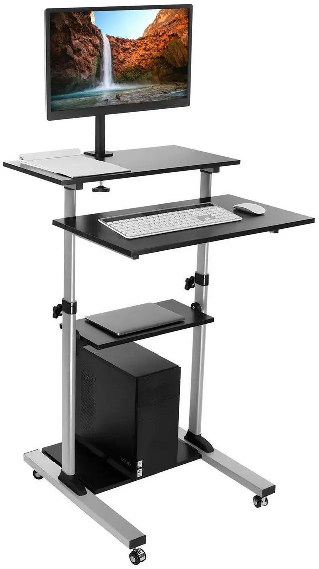 Mount-It! introduces the perfect height adjustable mobile stand-up desk. It is an ergonomic sit stand computer desk that allows you to raise and lower your work surface quickly and effortlessly to healthy sit-stand heights so you can work with more comfort. This portable desk also comes with a premium monitor riser/arm to raise the height of your computer monitor. Ideal for use as a mobile computer/laptop station for at the office, home, showroom, and classroom. Carefully designed platforms provide ample space for monitors, keyboards, mouse pad, a PC tower and a printer. Use with or without a monitor stand for an ergonomic layout. High quality steel frame with powder coating ensures durability and reliability. The height of the top two platforms can be adjusted from a maximum top shelf height of 54 inches to a minimum of 37 inches. 17 inches of height adjustment allows to for from a sitting position to a comfortable standing position. The locking casters allow the cart to be stationary or mobile when desired. Due to its size, maneuverability is excellent with total side width of 28" and a depth of 27.5". Its ergonomic, portable, space saving attributes make it an attractive choice in all types of businesses, office, trade-shows, mall kiosks, retail stores, factories, schools, hospital even at home. All necessary hardware and installation instructions are provided for assembly.