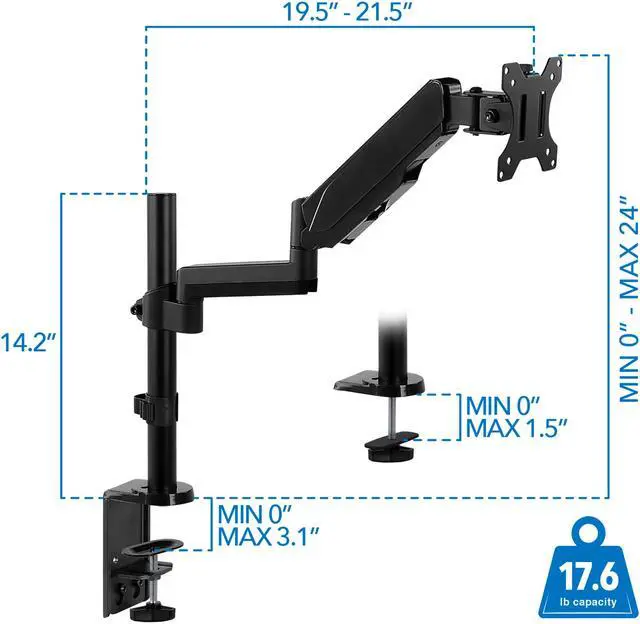 Raise your monitor to an ergonomic position and free up desk space with this single monitor mount. Designed for performance, this mount is made from aluminum and steel for sturdy use. This mount includes both clamp and grommet installation components to fit a variety of desktops. Gas spring allows for smooth and easy height adjustment. Tilt and swivel functionality offer multiple monitor angles for comfortable reading, and integrated cable management keeps your cords off your desktop.