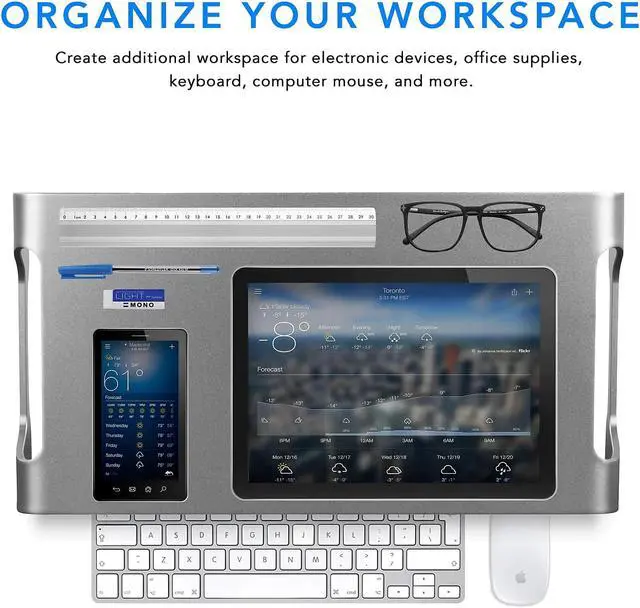 Sleek and elegant design. Our product is fabricated from same grade Aluminum as apple MacBook. Lightweight and stable. We incorporate smart weight reduction features into our design without compromising the stability and utility of the product. Safety. Anti-slip silicone tabs at bottom and top to securely hold your screen to the table. Durability. Scratch resistant Anodized Aluminum to improve the lifecycle of our product. Utility. Careful cutouts in frame to bundle wires and cables without cluttering your desk.