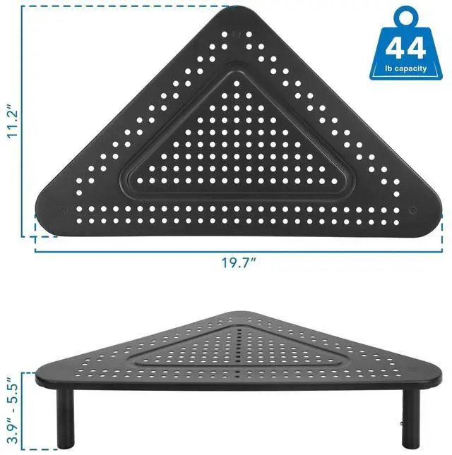 The MOUNT-IT! Corner Desk Monitor Stand is a unique triangular designed shelf for your screen that gives you space-saving storage, adjustable ergonomic viewing angles, and a strong, stable, stylish design aesthetic all in one.
