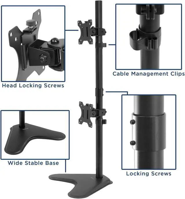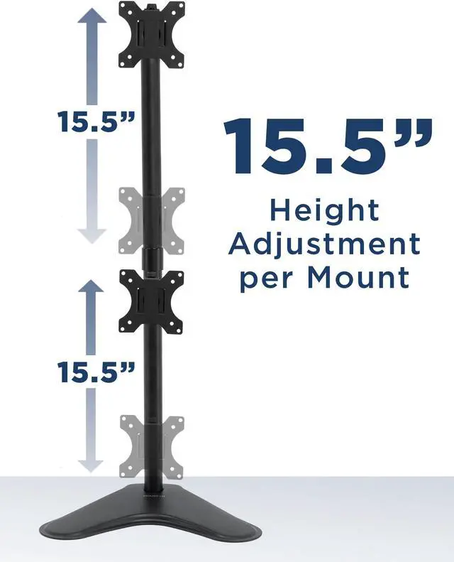 Raise your monitors at an ergonomic position and free up valuable desk space with this stacked dual monitor stand. Designed for performance, this desk stand is made from high grade steel built to resist scratches and supports screens up to 17.6 lbs each arm and screen size up to 32". Adjustable height, tilt, swivel and rotation functionalities offer optimal viewing angles. Comes with cable management clips to keep your wires organized.