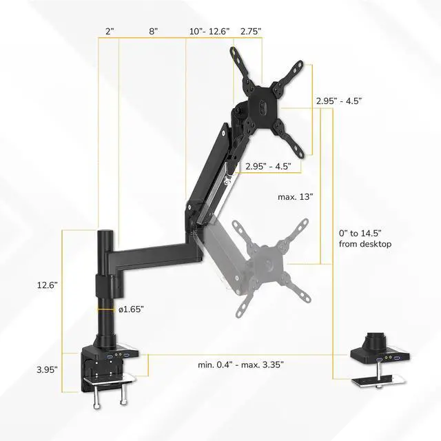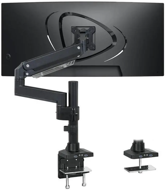 This Heavy-Duty Single Monitor Mount features a full-motion gas spring arm and boasts a load capacity of up to 33lbs, making it a great option for large or ultrawide monitors. It features VESA extensions, so it can hold screens up to 35" and sometimes bigger. The gas spring arm allows for smooth, fluid full-motion movements, allowing you to perfect your workspace throughout the day. Swivel, tilt and rotate your screen to desired viewing angle. Comes with (2) USB 3.0 and (2) multimedia ports.