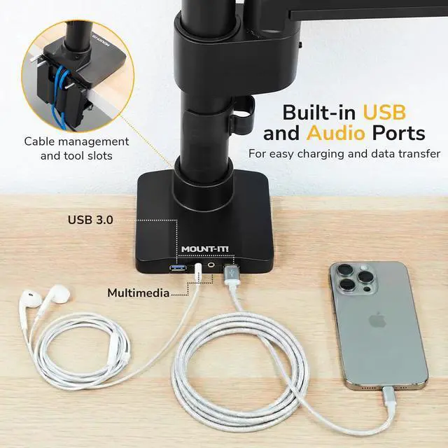 With the integrated 2x3.0 USB and multimedia ports on the mount base, data transmission, charging, and headset use have never been so convenient!