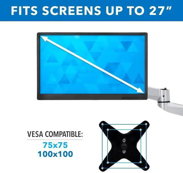 Fits up to 17 notebooks, Vesa 75, 100 compatible with 22, 23, 24, 27" screens, carries 19.8 lbs per arm.