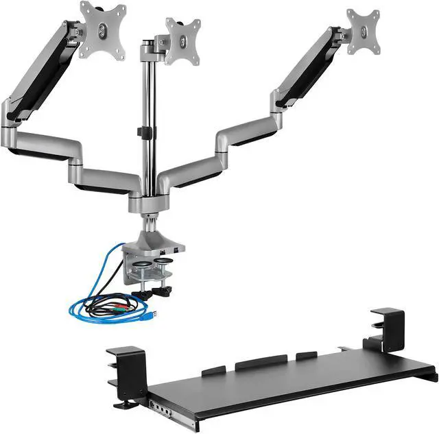 FEATURES: This triple monitor stand has counter-balanced gas spring arms for effortless adjustments and features (1) USB 3.0 port, (1) audio port and matching extension cables for each. It has a built-in cable management to keep your cords out of sight and is made out of heavy duty steel and aluminum alloy. It also comes with interchangeable C-clamp and grommet base mounts for desktops up to 4 inches wide.