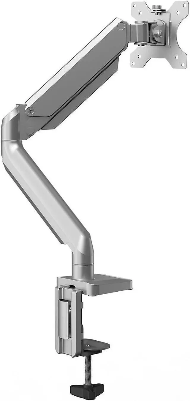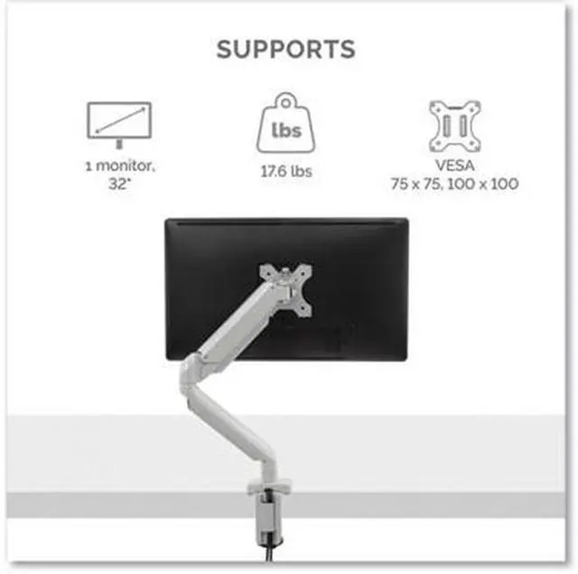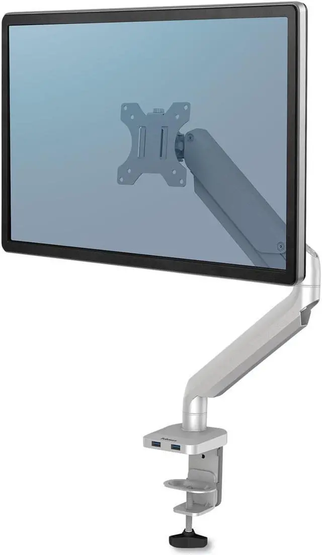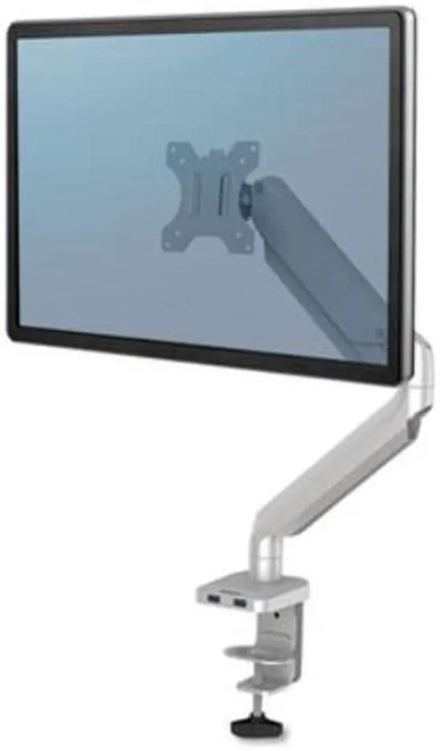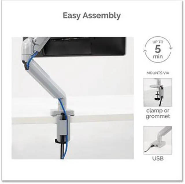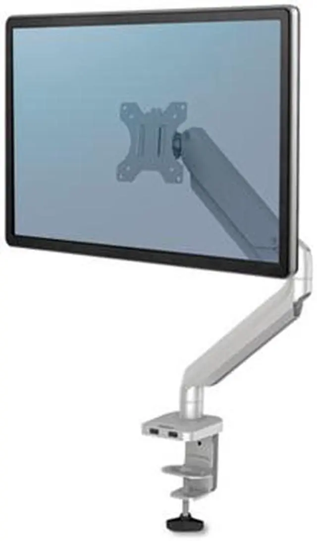 The Platinum Series single silver monitor arm 8056401 from Fellowes provides ergonomic viewing to help relieve neck and eye strain while optimizing desk space. The fully-independent arm holds up to 17.6 lbs. or 40 monitors and is easily installed using the Quick Fit VESA plate. The arm features gas spring technology for effortless adjustment and horizontal or vertical viewing rotation. Easily mounts to tables or desks via clamp (between .4-3.35 thick) or grommet (between .33-2.75 in diameter). An innovative cable management system reduces clutter and keeps you productive.