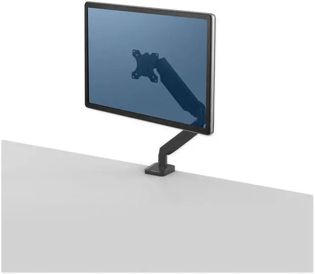 Elevate your workspace with the Fellowes Platinum Series single monitor arm. This gas spring technology monitor arm is designed to create effortless adjustments while being functional and comfortable. It provides an ergonomic viewing experience while maximizing desk space.