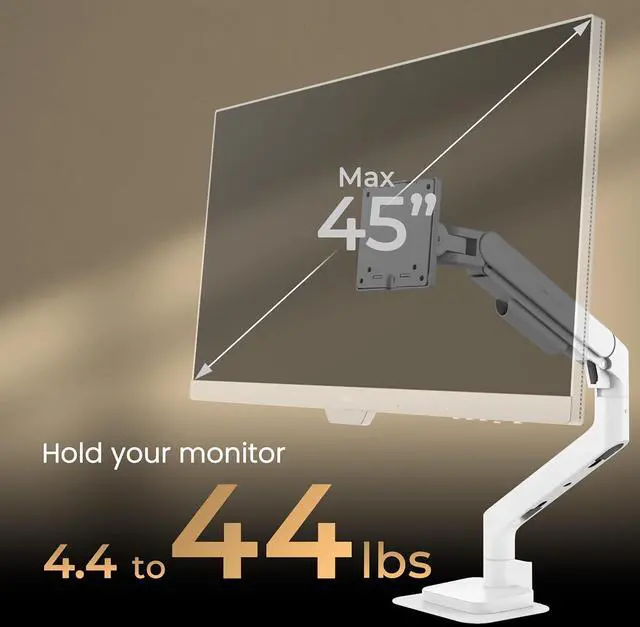 Designed to support monitors weighing up to 44 lbs and measuring 45 inches or smaller, with standard VESA mounting holes (75x75 mm or 100x100 mm).