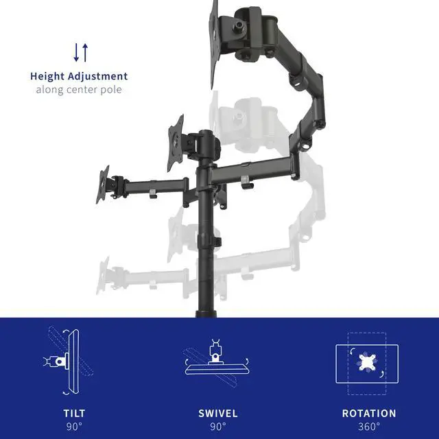 Brand new triple monitor mount (STAND-V003M) from VIVO! Clear up valuable work space on your desk with this heavy duty three monitor stand. Constructed of high grade steel, this mount was built to resist scratches. The newly designed VESA plates allows each individual plate to be adjusted up and down by 1.1" so your monitors will be perfectly aligned. This stand comes in a black matte finish.
