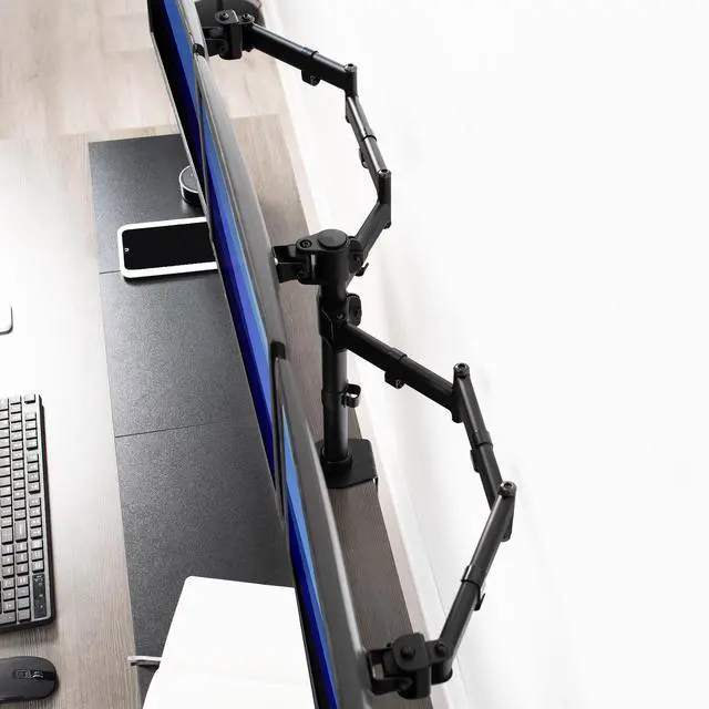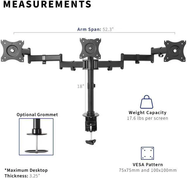 - Supports three LCD screens up to 17.6lbs and 24" in size each (will fit 27" screens but will allow very limited angled screen positioning)