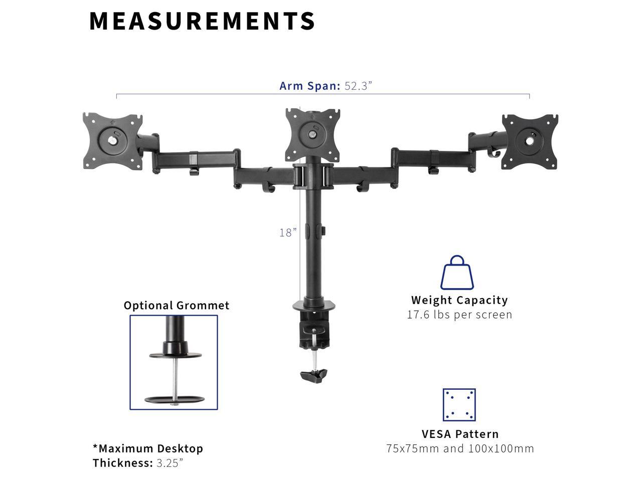 - Fits 13" to 24" Screens: Triple monitor mount holds three computer monitors 13" to 24", up to 17.6 lbs each, and with VESA 75x75mm or 100x100mm mounting holes (will fit 27" screens but will allow very limited angled screen positioning)