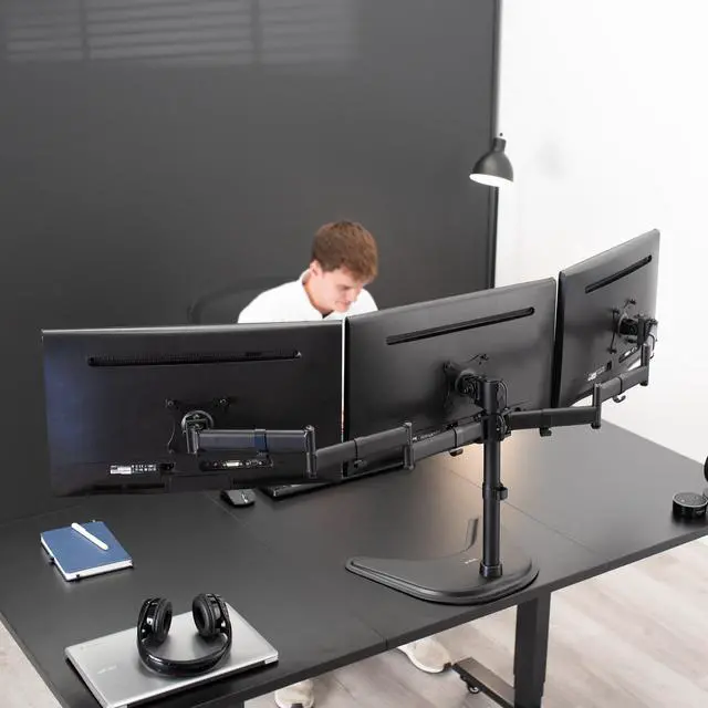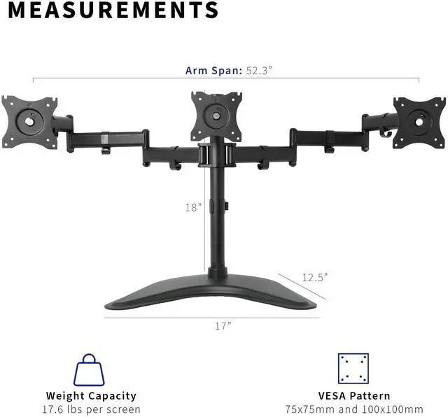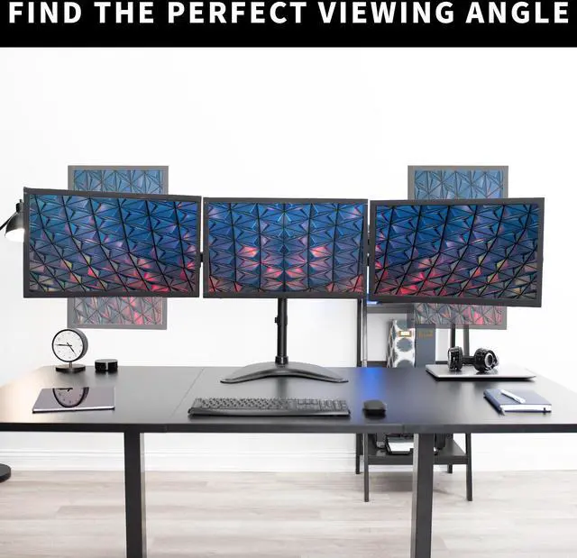 Triple monitor stand (STAND-V003P) from VIVO! Clear up valuable work space on your desk with this heavy duty three monitor mount. Constructed of high grade steel, this stand was built to resist scratches. The VESA plates allows each individual plate to be adjusted up and down by 1.1" so your monitors will be perfectly aligned. This stand comes in a black matte finish.