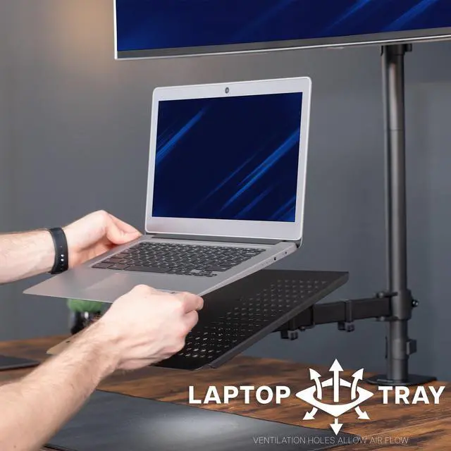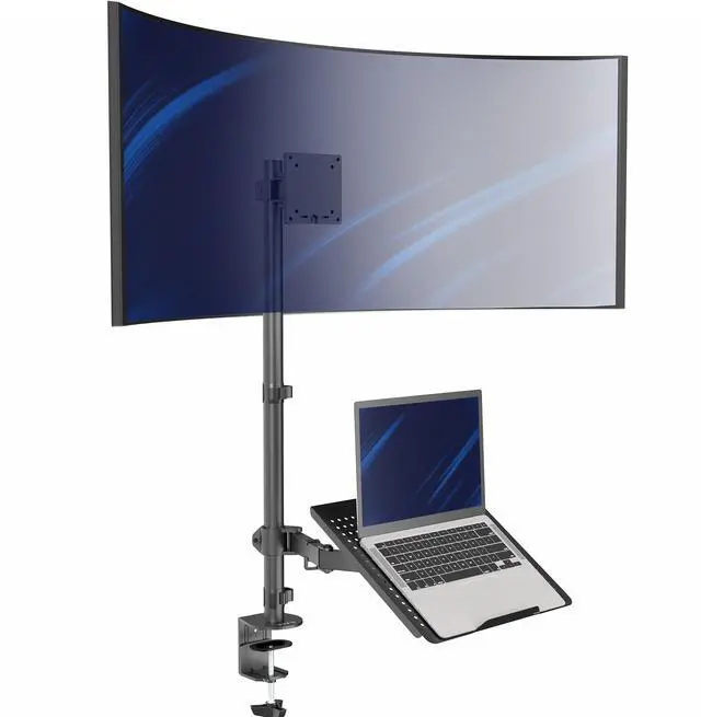 Clear up valuable desk space with a solid stand for your computer screen and notebook with the Single Ultrawide Monitor and Laptop Extra Tall Desk Mount (STAND-V012C) from VIVO! This heavy-duty dual-arm mount attaches to the back of your desk, freeing up space that the original monitor stand would occupy. An advanced arm design holds ultrawide screens up to 49 in size and 44 lbs in weight, elevating your monitor for optimal viewing angles. The sturdy laptop tray provides a solid surface for typing and positions your notebook at a comfortable height. The mounting bracket uses universal VESA patterns 75x75mm and 100x100mm, and the heavy-duty C-clamp installs to desks with no drilling required, protecting your table surface.