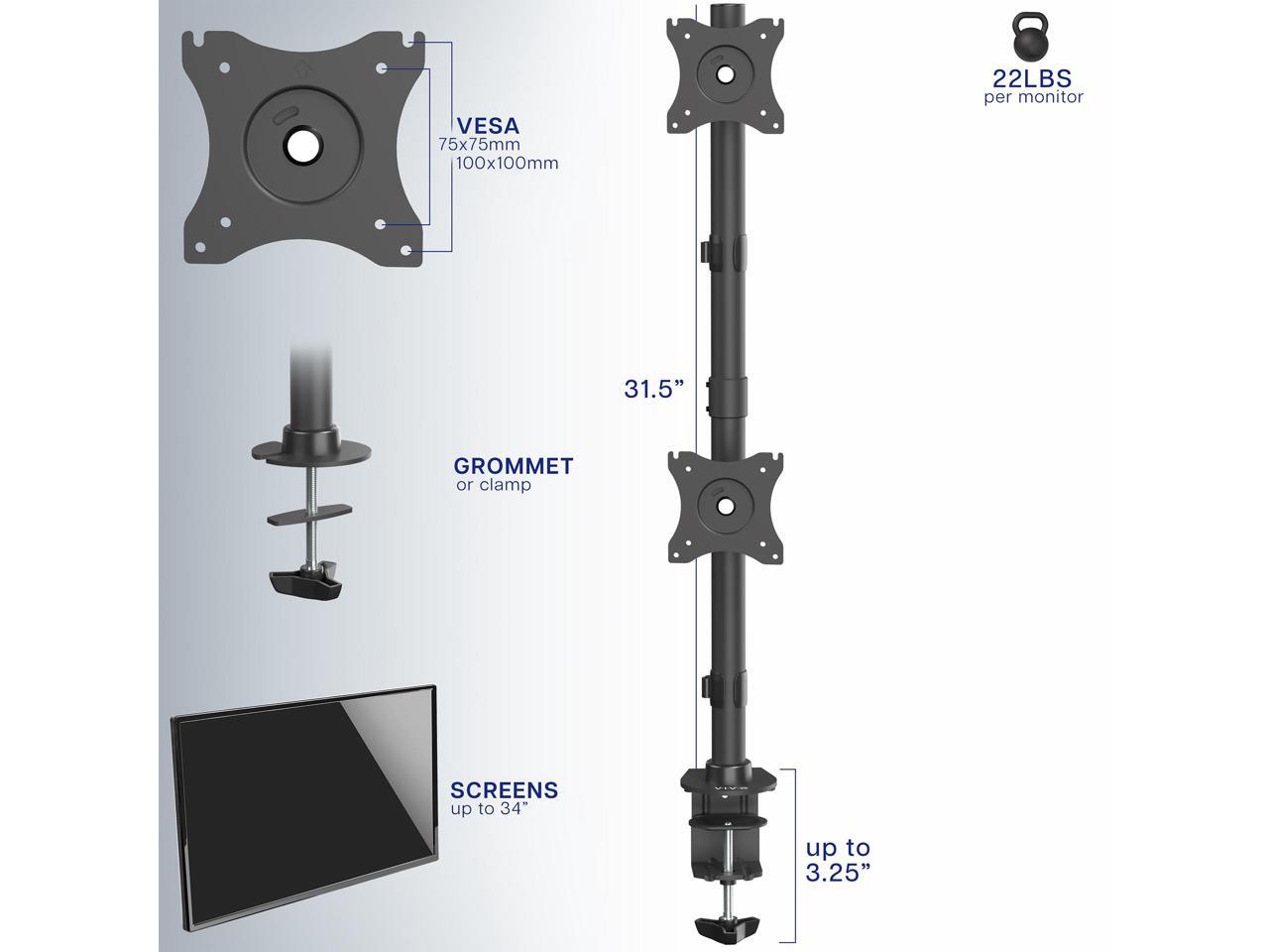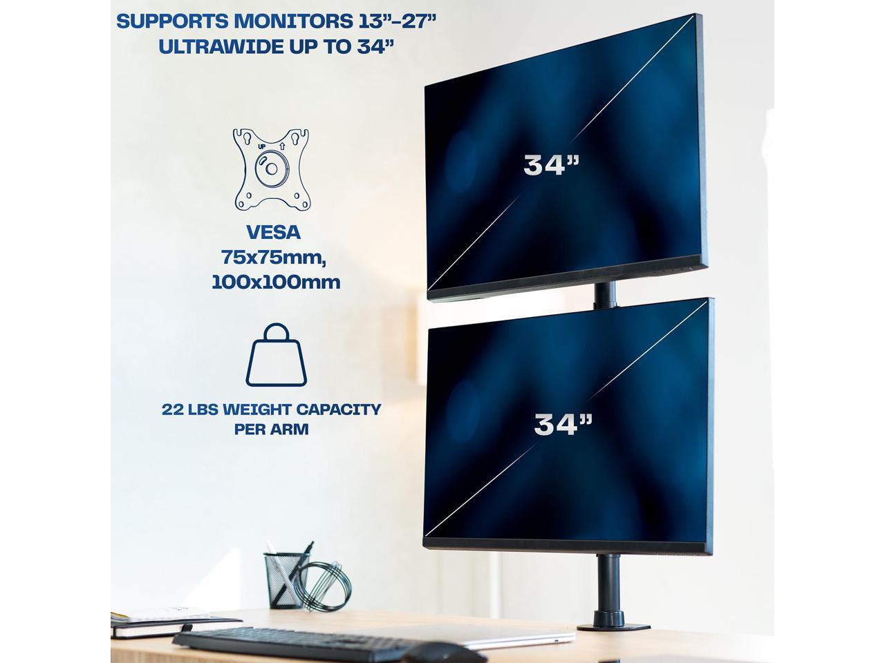 Ultrawide Compatibility: Dual vertically stacked monitor mount fitting two ultra-wide screens 13 to 34 in size and up to 22 lbs in weight (each) with VESA 75x75mm or 100x100mm mounting holes