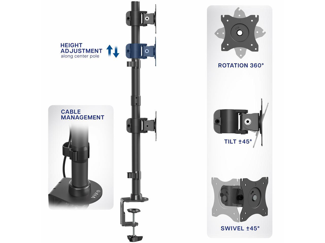Vertically Stacked Array: Holds monitors in a stacked position for top and bottom browsing and gaming. Detachable cable clips keep your power and AV cords clean and organized