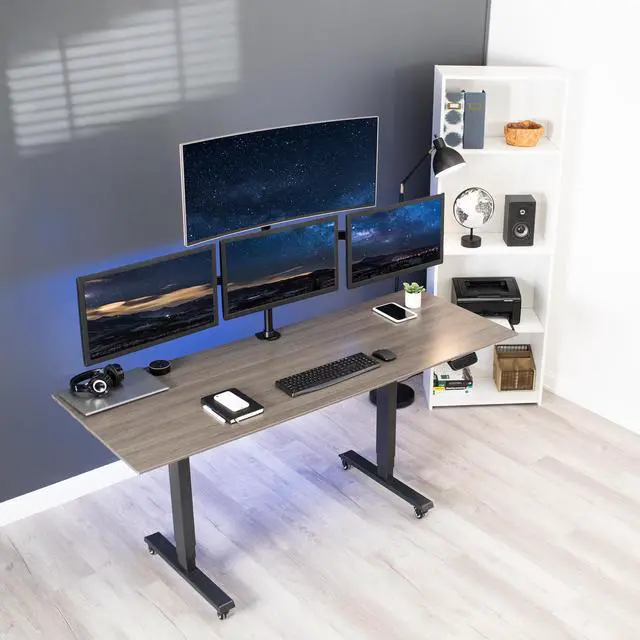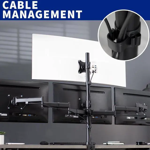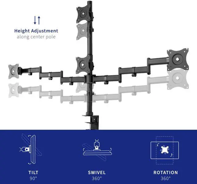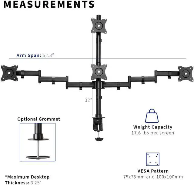 Quad monitor articulating desk mount from VIVO. STAND-V004Y is complete with high-grade steel and aluminum, built to support 4 screens up to 24" in size and weighing up to 17.6 lbs each. The fully articulating arms feature multiple adjustable joints which can be tightened to create fluid or stationary arm movement. The heavy-duty C-clamp attaches to the back of your desk which helps maintain valuable desk space while providing excellent support for the entire mount and 4 screens. An optional grommet mounting option comes with this stand. Cable management clips keep AV and power cords organized and out of sight.