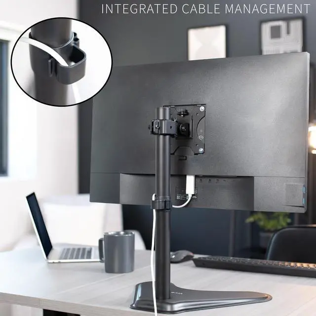 Elevate your monitor to a comfortable viewing height with the Single Monitor Desk Stand (STAND-V001H) from VIVO! Constructed of high-grade steel, this stand was built to resist scratches and support monitor screens weighing up to 22 pounds. The modern appearance blends well with many home and office settings. Featuring full articulation and height adjustment along the center pole for optimal viewing, a removable VESA plate for easy mounting, and integrated cable management to keep cords clean and organized, this stand was built for workplace excellence. All of the hardware and instructions are provided for fast and easy installation, so you can get your screen mounted and enjoy ideal viewing angles in no time!