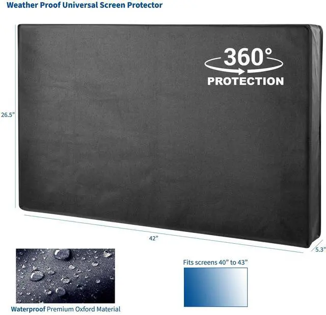 Protect your screen from the elements with Black 40" to 43" Flat Screen TV Cover Protector (COVER-TV040B) from VIVO! Designed with weatherproof material, this case will keep your equipment safe and secure. Its made with supreme quality oxford for long-lasting use and utilizes lock stitching to prevent fray. The bottom and backside openings feature industrial quality velcro for secure opening and closing, and you can keep your remote in the back velcro pocket for convenient storage. The cover fits directly over most wall mounts for a nice clean setup.
