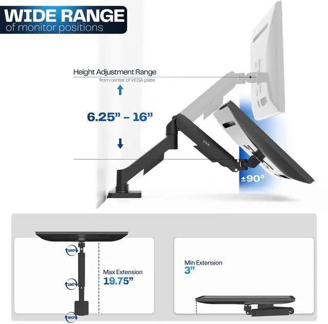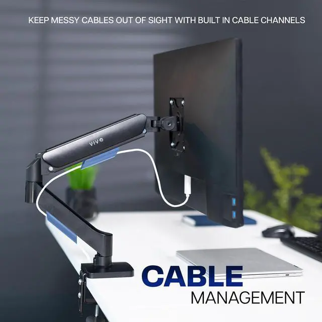 Elevate your monitor to an ergonomic height and adjust viewing angles with just the touch of a hand with the Mechanical Arm Single Monitor Desk Mount (STAND-V001O) from VIVO! Supporting 17" to 32" monitors weighing up to 19.8 lbs, this counterbalance mount provides simple height adjustment without the use of tools. Featuring high-quality construction, flexible joints, integrated cable management, sturdy clamp or grommet mounting, and more, this stand is ready to transform your workspace!