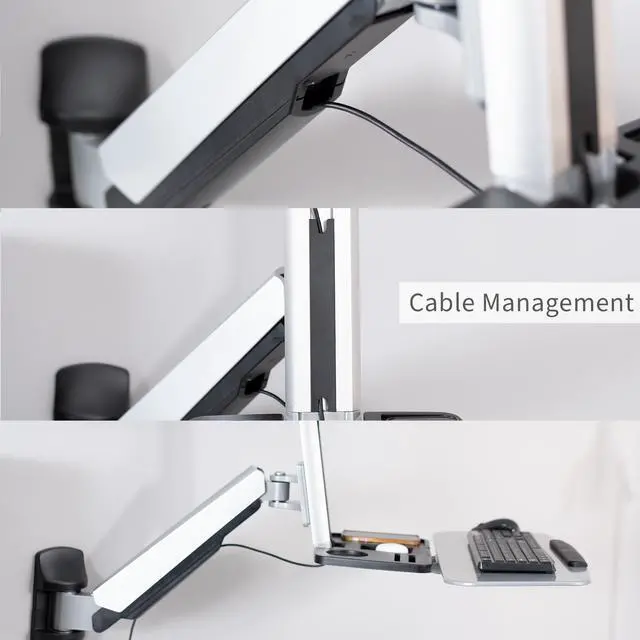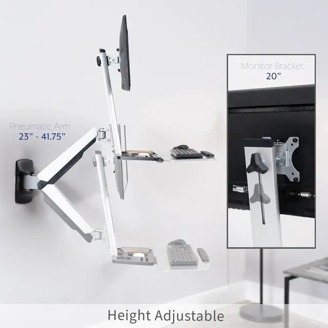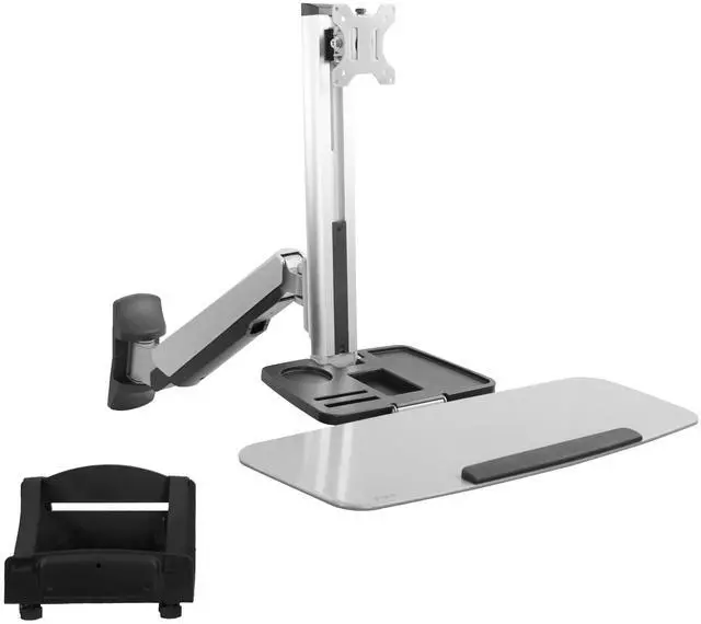 Single monitor sit-stand wall mounting workstation (STAND-SIT1W) with deluxe gas spring technology from VIVO. This sleek silver station mounts directly to stud or concrete walls and allows you to work from either a standing or sitting position. Included is a CPU mount that holds your computer tower off the ground saving more space for your work area.