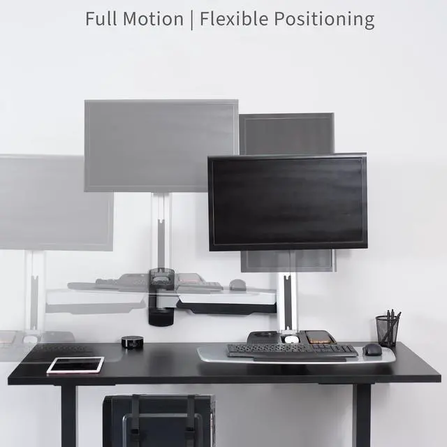 - The counter balance gas spring allows for simple hand adjustment to transition between standing and sitting positions in a matter of seconds without the use of tools.