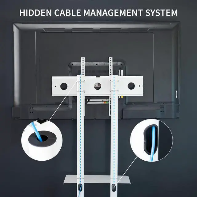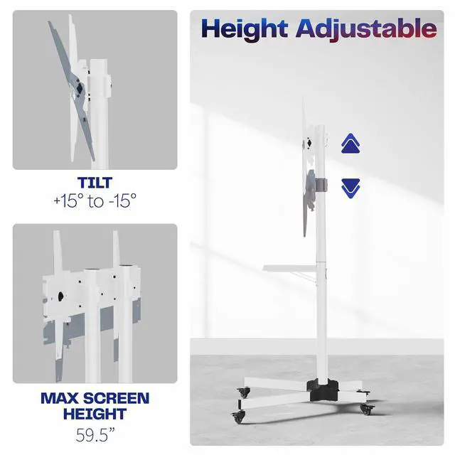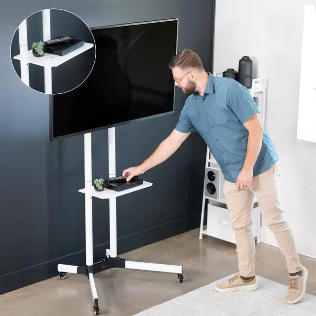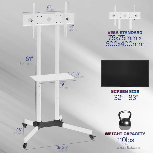 Enhance your visual display with the White Mobile TV Cart (STAND-TV03W) from VIVO! This sturdy portable TV mount holds the majority of flat and curved screens from 32 to 83 in size and has a weight capacity of 110 lbs. Features include 15-degree screen tilt, locking wheels, cable management, and a middle storage shelf. This television stand provides the perfect setup for both home and professional use whether youre gaming on your Xbox, giving a work presentation at the office, or teaching in a classroom. Popular Compatible Screen Sizes (Not Comprehensive): 32, 37, 40, 42, 43, 48, 49, 50, 55, 60, 65, 70, 75, 77, 82, 83 Screen Types: Holds most LCD, LED, OLED, 4K, Smart, Outdoor, Flat, and Curved TVs