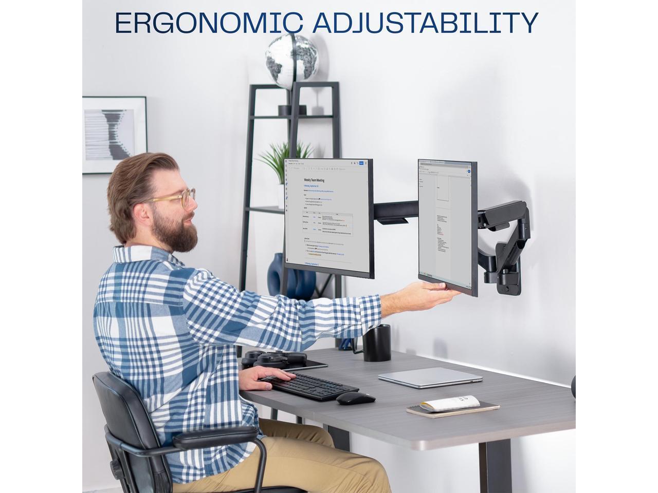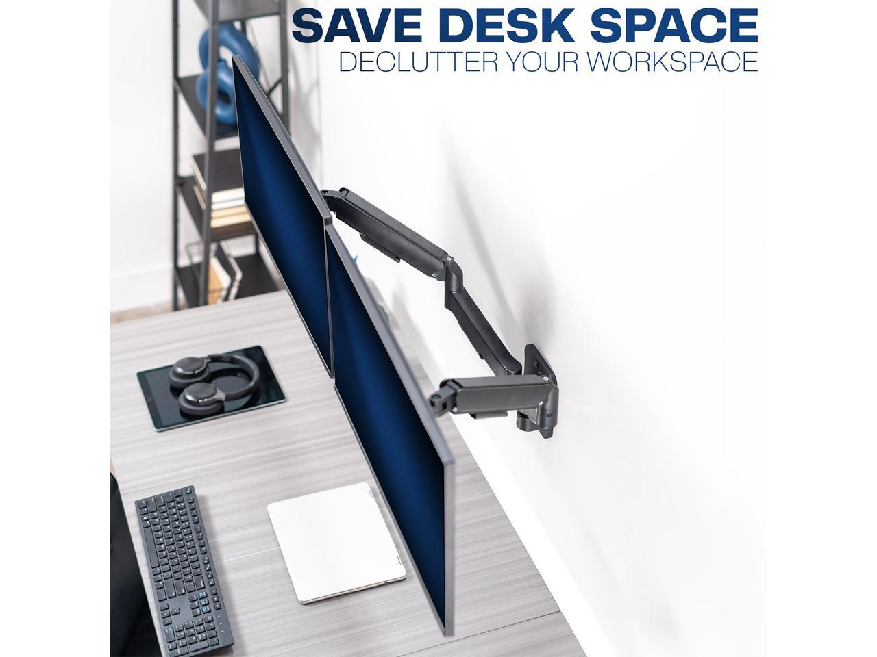 - Counter-Balance Wall Mount: Clear up valuable desk space with a double extended pneumatic spring arm wall mount. Features toolless and instant height adjustment, allowing you to find the perfect ergonomic viewing angle
