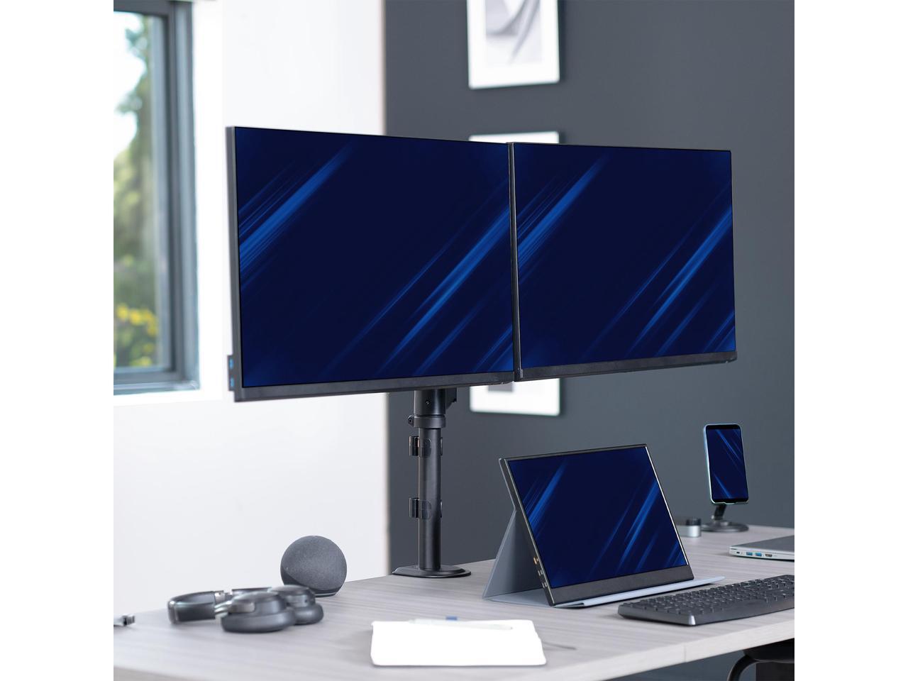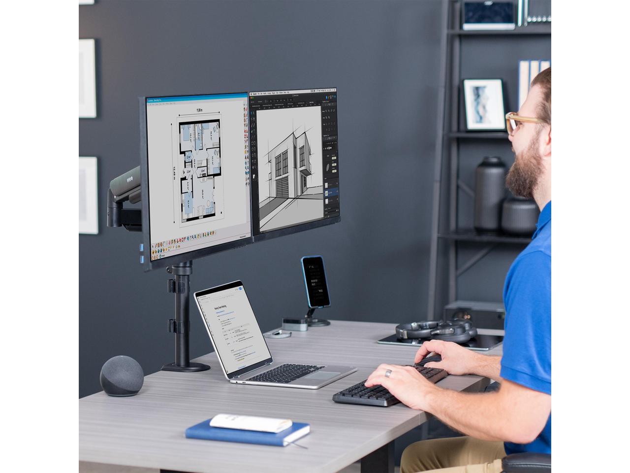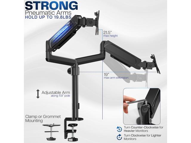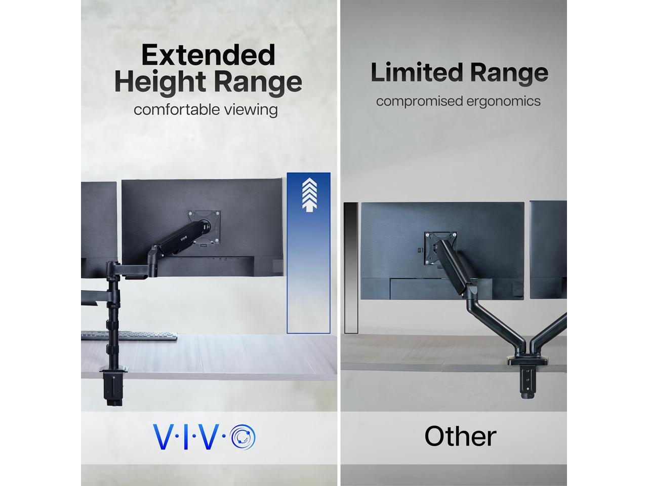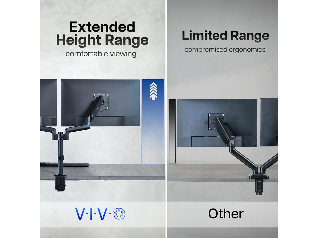 - Articulation and Height Adjustment: Flexible arms offer smooth tilt, swivel, and full rotation for comfortable viewing angles. Dual mechanical springs provide smooth height transitions by perfectly counterbalancing the weight of your monitors