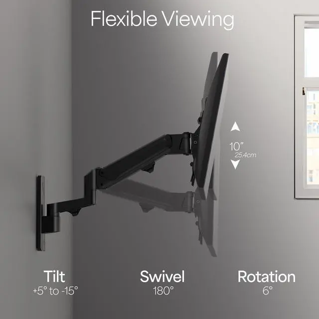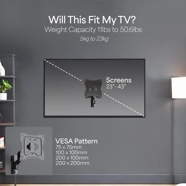 Protect your equipment and find excellent viewing angles with the Premium Aluminum TV Wall Mount (MOUNT-G200B) from VIVO! Thanks to the ergonomic design of this mount, you can reduce the strain on your neck, back, and eyes during your favorite sports game or work presentation. Getting your screen mounted to the wall clears up valuable space and protects your TV from falls and collisions. The solid steel and aluminum construction with a stable design supports 23" to 43" flat screen TVs weighing up to 50.6 lbs with VESA 75x75mm to 200x200mm mounting holes. Experience excellent viewing angles with -15° to +5° tilt, 180° swivel, and 6° rotation in addition to 10" of height adjustment with powerful pneumatic spring lift. A cable management system has been integrated to keep potentially messy cords clean and organized. All the necessary hardware and instructions are provided to get your new mount installed in no time!