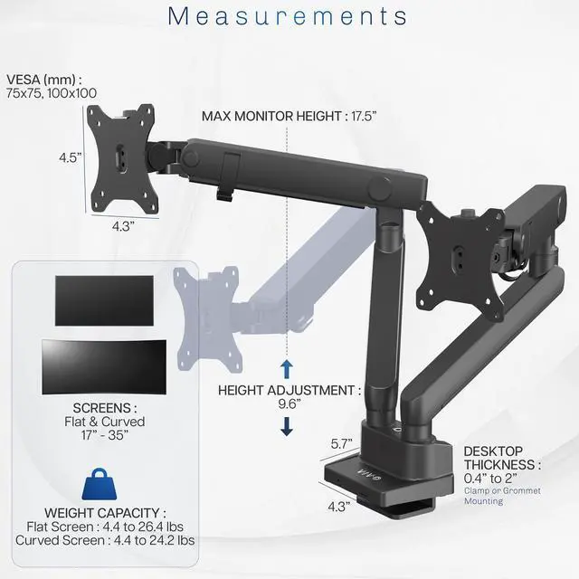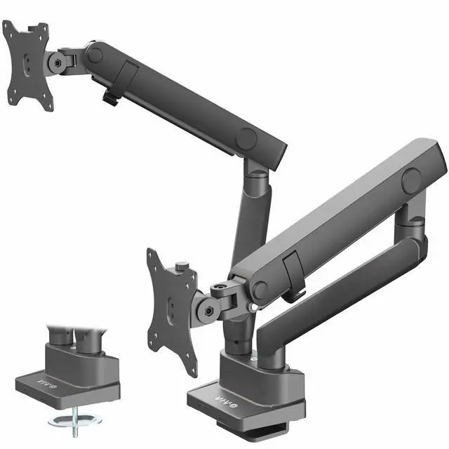 Reclaim your desk space and enjoy comfortable viewing angles with Premium Dual Monitor Mount (STAND-V102BB) from VIVO! Elevate not just one, but two ultrawide monitors to an ergonomic height and adjust the viewing angle with just the touch of a hand. Featuring high-quality aluminum construction, flexible joints, smooth height adjustment, a sturdy desk clamp and grommet mount, integrated cable management, topside installation, and more, this stand is ready to transform your workspace. The versatility of screen placement encourages comfortable viewing that aids in decreased muscle strain on the neck, back, and shoulders. The classy appearance adds a modern look to any office while providing excellent support for your 17" to 35" monitors. All hardware and instructions are provided for easy assembly, so you can get your stand secured and monitors mounted in no time!