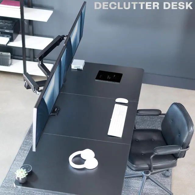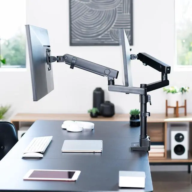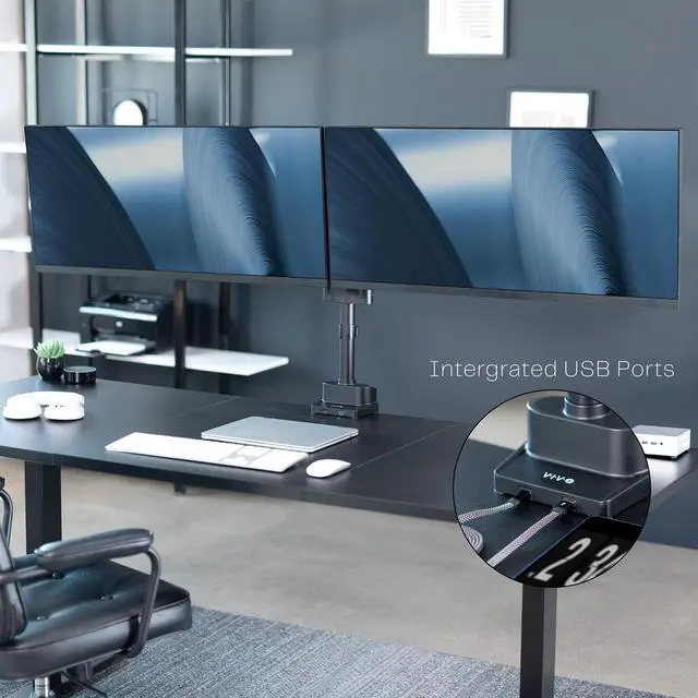 Reclaim your desk space and enjoy comfortable viewing angles with Premium Dual Monitor Mount with USB Ports (STAND-V102BDU) from VIVO! Elevate not just one, but two ultrawide monitors to an ergonomic height and adjust the viewing angle with just the touch of a hand. Featuring high-quality aluminum construction, flexible joints, smooth height adjustment, a sturdy desk clamp and grommet mount, integrated cable management, topside installation, and USB ports, this stand is ready to transform your workspace. The versatility of screen placement encourages comfortable viewing that aids in decreased muscle strain on the neck, back, and shoulders. The classy appearance adds a modern look to any office while providing excellent support for your 17" to 40" monitors. All hardware and instructions are provided for easy assembly, so you can get your stand secured and monitors mounted in no time!