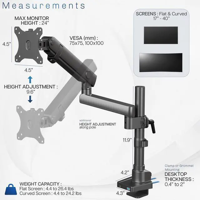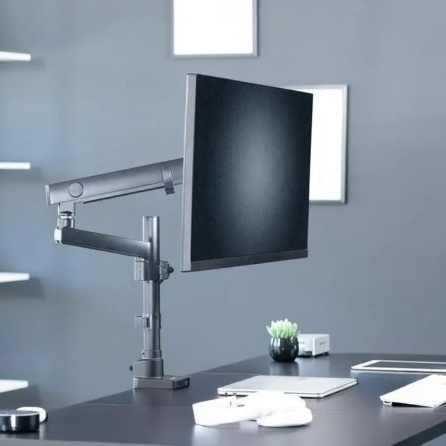 Reclaim your desk space and enjoy comfortable viewing angles with Premium Single Monitor Mount with USB Ports (STAND-V101BDU) from VIVO! Elevate your monitor to an ergonomic height and adjust the viewing angle with just the touch of a hand. Featuring high-quality aluminum construction, flexible joints, smooth height adjustment, a sturdy desk clamp and grommet mount, integrated cable management, topside installation, and USB ports, this stand is ready to transform your workspace. The versatility of screen placement encourages comfortable viewing that aids in decreased muscle strain on the neck, back, and shoulders. The classy appearance adds a modern look to any office while providing excellent support for your 17" to 40" monitor. All hardware and instructions are provided for easy assembly, so you can get your stand secured and monitor mounted in no time!