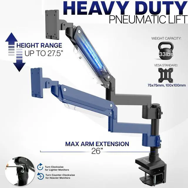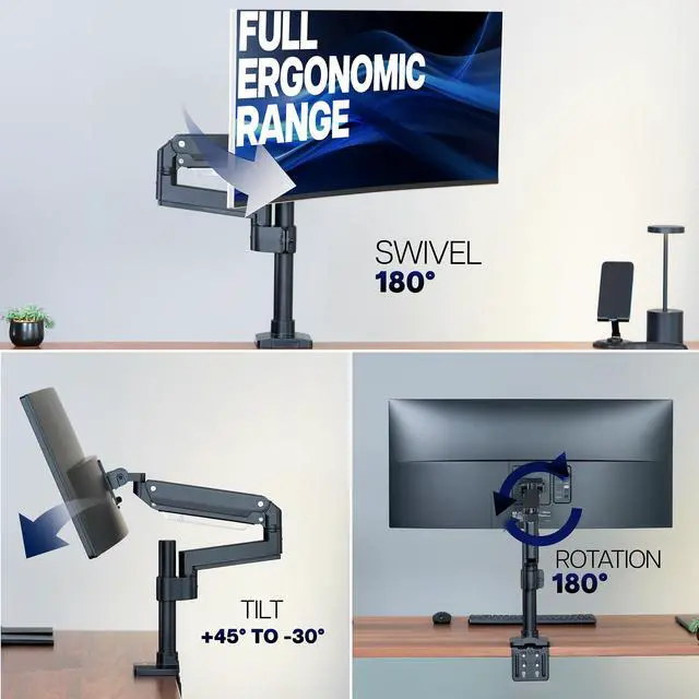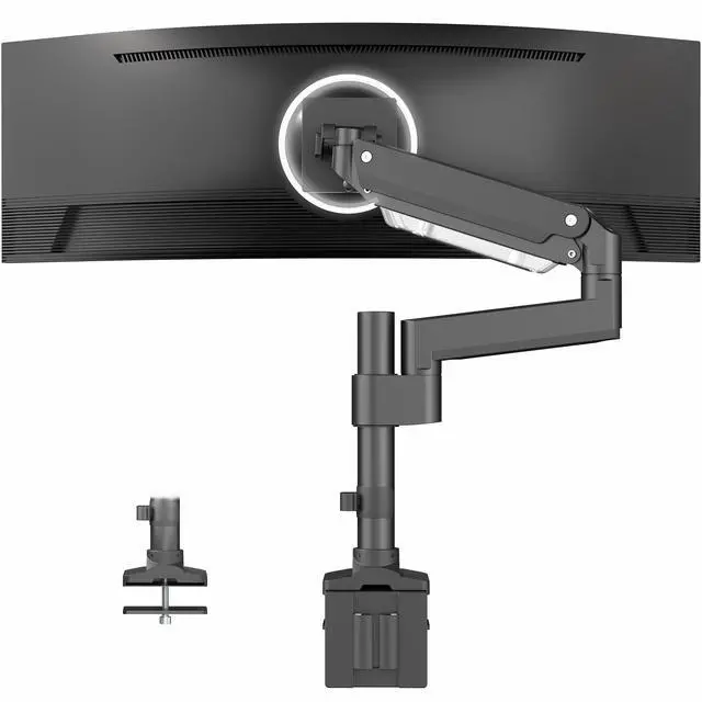 Reclaim your desk space and enjoy comfortable viewing angles with Premium Single Monitor Arm with Extension Pole (STAND-V101GT) from VIVO! Elevate your ultrawide monitor to an ergonomic height and adjust the viewing angle with just the touch of a hand. Featuring high-quality aluminum construction, flexible joints, smooth height adjustment, a sturdy desk clamp and grommet mount, integrated cable management, and more, this stand is ready to transform your workspace. The versatility of screen placement encourages comfortable viewing that aids in decreased muscle strain on the neck, back, and shoulders. The classy appearance adds a modern look to any office while providing excellent support for your ultrawide monitor (up to 49"). All hardware and instructions are provided for easy assembly, so you can get your stand secured and monitor mounted in no time!
