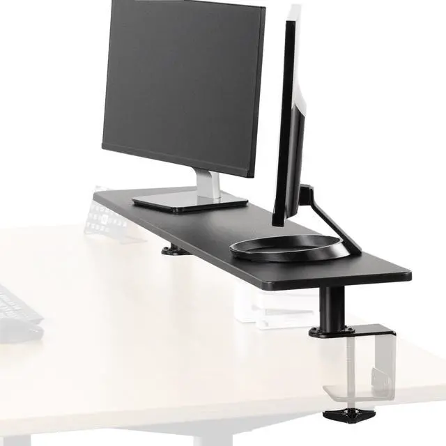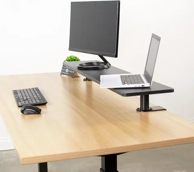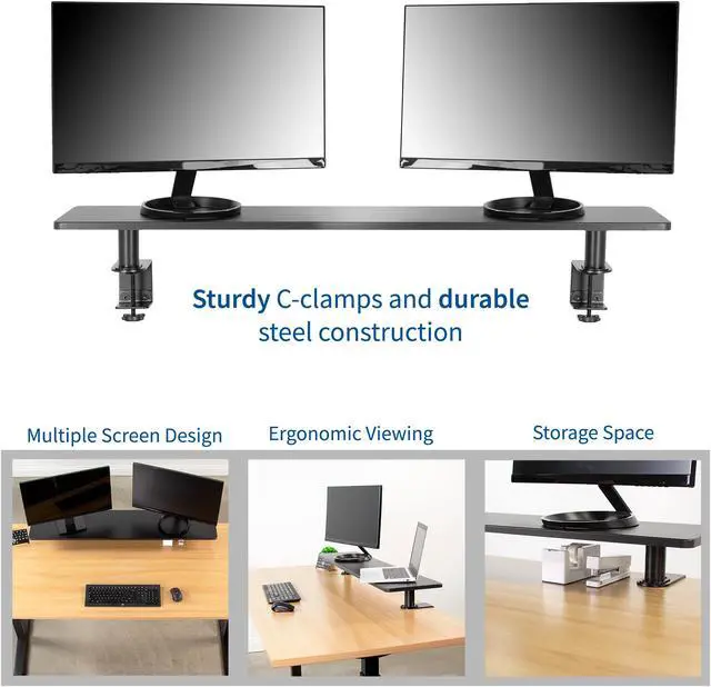 Increase storage space and enjoy comfortable viewing angles with Extra Large Clamp-on Desk Shelf (STAND-SHELF46B) from VIVO! Raise your monitors approximately 4.5 above the desk surface with this trendy 46 x 10 platform, achieving proper ergonomic viewing angles that aid in good posture and help reduce neck and back strain. Adding a second tier to your desk with two sturdy C-clamps, the shelf creates vertical storage space above and below the riser for increased work comfort and organization. The shelf surface holds up to 35 lbs, allowing room for multiple monitor and laptop displays along with small office supplies and decor. All the necessary hardware and instructions are provided for easy assembly, so you can transform your desk layout in no time!