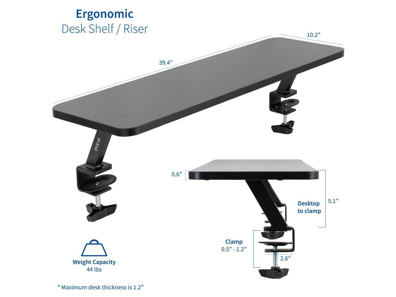VIVO Monitor Shelf Solutions: We create affordable solutions to transform your unique workspace. This clamp-on shelf gives your desk an additional tier for increased storage space and ergonomic viewing angles. Please Note: Maximum desk thickness is 1.2"