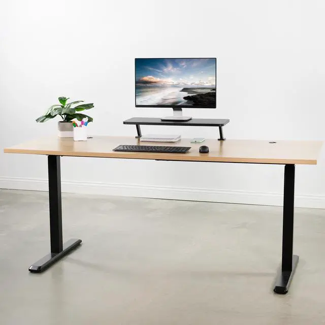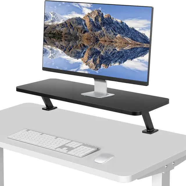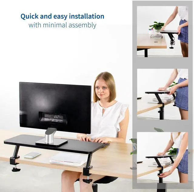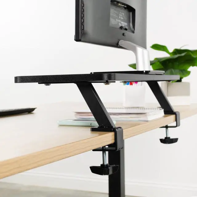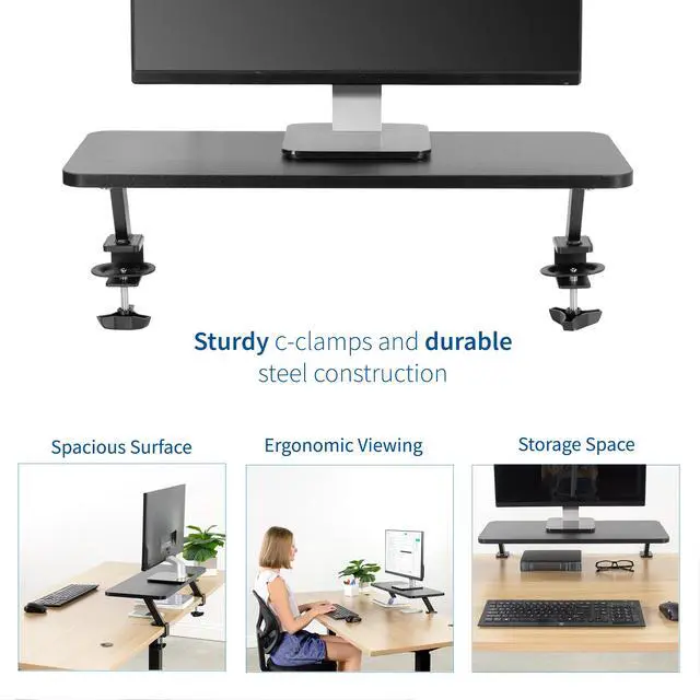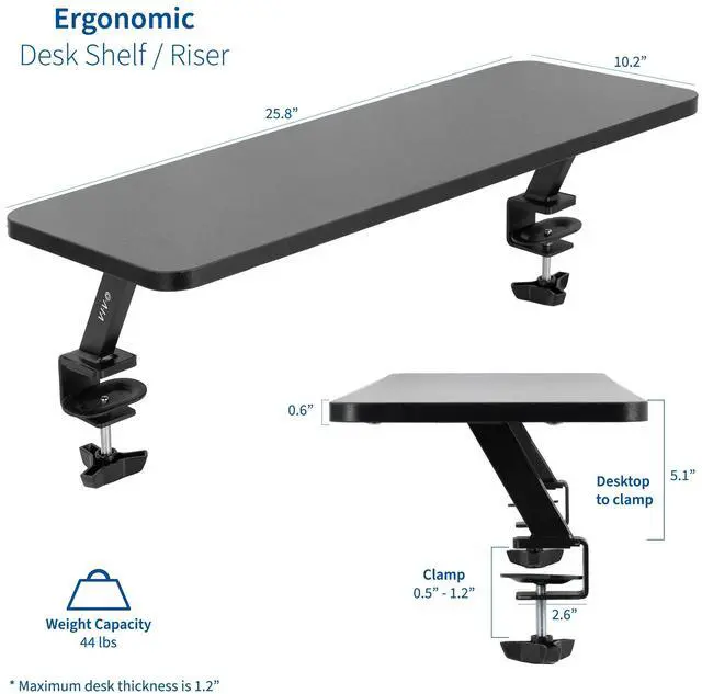 Increase storage space and enjoy comfortable viewing angles with Small Clamp-on Desk Shelf (STAND-SHELF24B) from VIVO! Raise your monitors approximately 5.1 above the desk surface with this trendy 25.8 x 10.2 platform, achieving proper ergonomic viewing angles that aid in good posture and help reduce neck and back strain. Adding a second tier to your desk with two sturdy C-clamps, the shelf creates vertical storage space above and below the riser for increased work comfort and organization. The shelf surface holds up to 44 lbs, allowing room for single monitor and laptop displays along with small office supplies and decor. All the necessary hardware and instructions are provided for easy assembly, so you can transform your desk layout in no time!