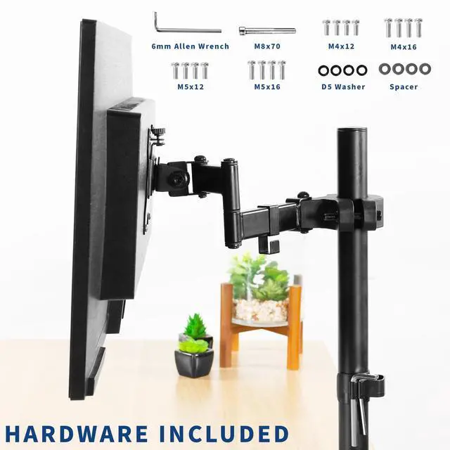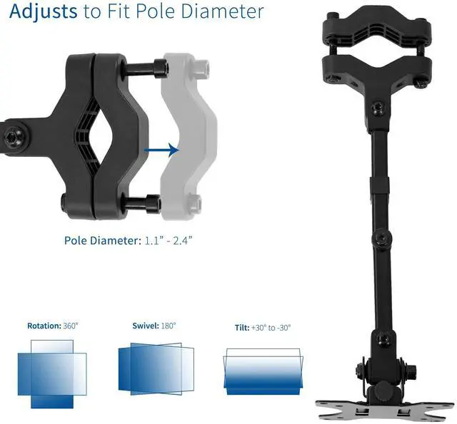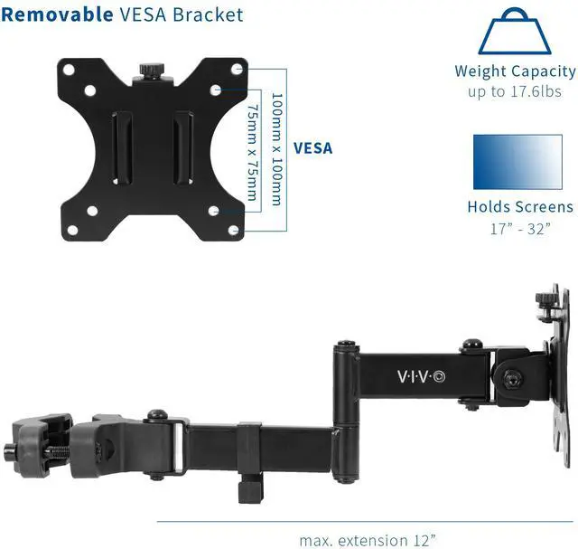 Mounting your monitor or small TV just got easier with Pole Mount Monitor Arm for VESA 75x75mm and 100x100mm (MOUNT-POLE01A) from VIVO! Whether you want to update your current monitor stands VESA compatibility or add mounting capability to an existing pole, this sturdy arm has you covered. It holds one 17 to 32 screen weighing up to 17.6 lbs and fits pole diameters from 1.1 to 2.4. Once your screen is mounted, this durable bracket is adjustable with +30° to -30° tilt, 180° swivel, and 360° rotation for comfortable viewing angles that relieve tension on the neck, back, and shoulders. We provide all the necessary hardware for assembly, and a removable VESA plate makes mounting and unmounting your screen a fast and easy process. Please Note: Pole is not included.