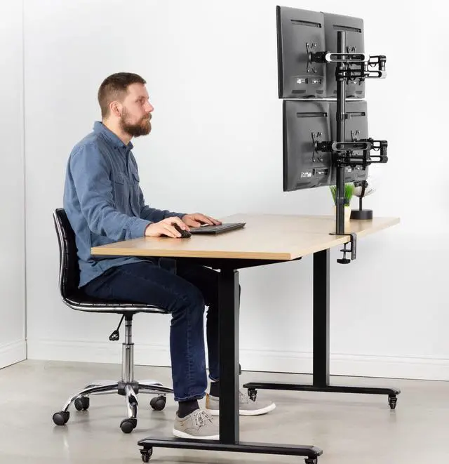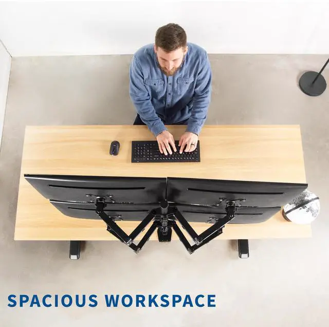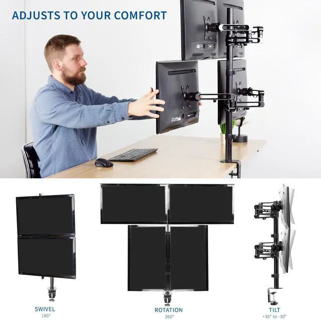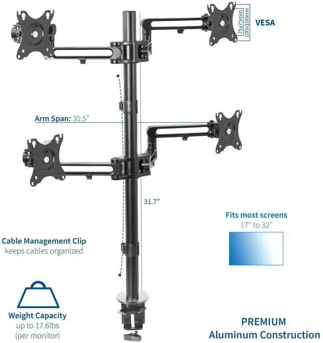 Give your workspace an ergonomic setup and increase viewing capability with Quad Monitor Desk Mount (STAND-V104Y) from VIVO! Quad screen displays are perfect for monitoring live camera footage, performing extensive analysis, and more! This premium stand is made of aluminum for a sleeker, more elegant look and provides excellent support for your monitors. It attaches to the back of your desk, freeing up valuable workspace and giving you the height, screen angle, and orientation of your choice. Designed for 17 to 32 screens, the stand will fit any traditional or modern space and strongly secures all of your monitors in a suspended position for better sight alignment. The mounting bracket uses universal VESA patterns 75x75mm and 100x100mm with a keyhole pattern mounting system for easy installation.