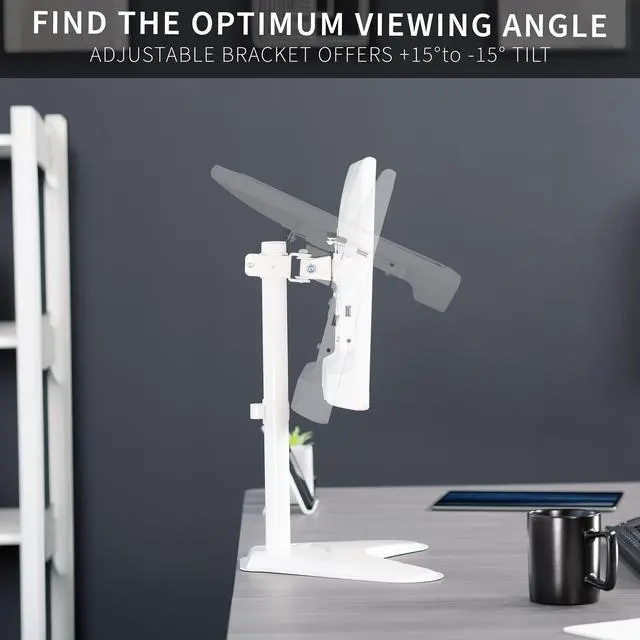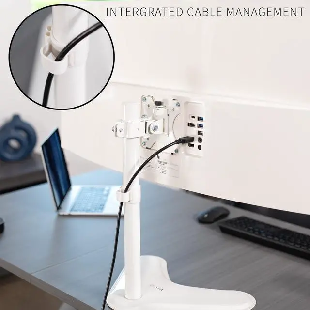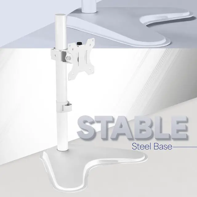 Elevate your monitor to a comfortable viewing height with the White Single Monitor Desk Stand (STAND-V001HW) from VIVO! Constructed of high-grade steel, this stand was built to resist scratches and support monitor screens weighing up to 22 pounds. The modern appearance blends well with many home and office settings. Featuring full articulation and height adjustment along the center pole for optimal viewing, a removable VESA plate for easy mounting, and integrated cable management to keep cords clean and organized, this stand was built for workplace excellence. All of the hardware and instructions are provided for fast and easy installation, so you can get your screen mounted and enjoy ideal viewing angles in no time!