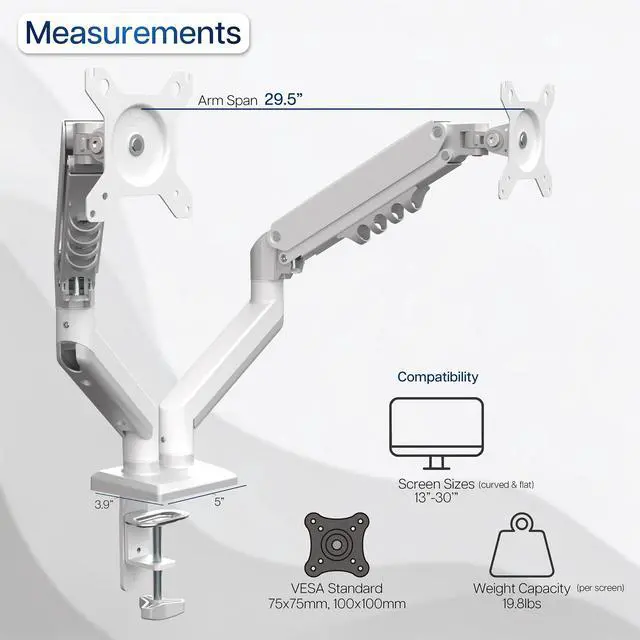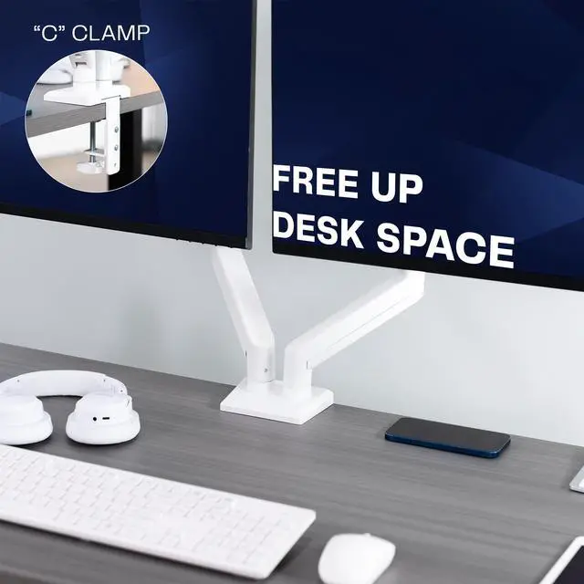 Increase the comfort and efficiency of your workstation with the White Tension Spring Arm Dual Monitor Desk Mount (STAND-V102OW) from VIVO! Displaying your screens at a comfortable viewing height, this sturdy stand perfectly counterbalances the weight of your 13 to 30 monitors (up to 19.8 lbs) for optimal ergonomic positioning. Featuring steel and aluminum construction, flexible joints, screen articulation, smooth height adjustment, a sturdy desk clamp and grommet mount, integrated cable management, and more, these monitor arms are ready to transform your workspace. All hardware and instructions are provided for easy assembly, so you can get your stand secured and monitor mounted in no time!