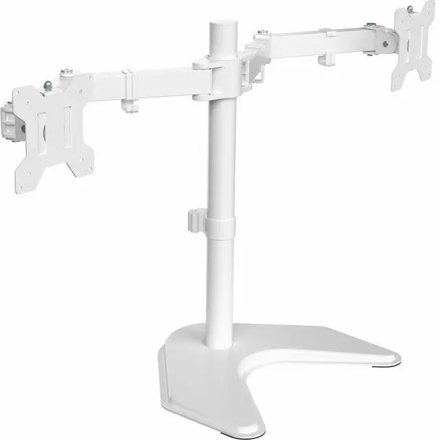 Enhance your monitor display and enjoy ergonomic viewing angles with the White Dual Monitor Desk Stand (STAND-V002FW) from VIVO, featuring an extra large 13" x 10.5" base. Fits most LCD monitors 13" to 27" and supports up to 22 lbs per monitor. Every joint is able to be tightened, so you can adjust exactly how fluid/stationary you want everything to be. Special features include the ability for each individual VESA plate to be adjusted up and down by .5" so your monitors will be perfectly aligned (see pictures and video for more information). We also made mounting your monitors easy with detachable VESA plates that screw into your monitor and then slide back onto the frame of the stand. The mount has standard VESA 75x75mm and 100x100mm mounting holes.