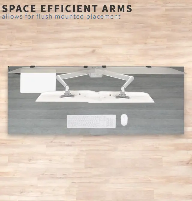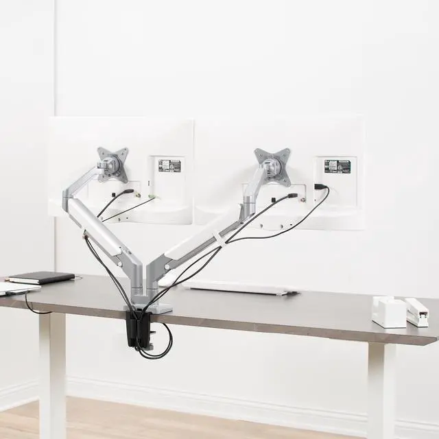 Save desk space and raise two monitors to an ergonomic viewing height with the Silver Pneumatic Arm Dual Monitor Desk Mount (STAND-V200A) from VIVO! The advanced space-saving design provides more distance between you and your screens, creating comfortable viewing while keeping the arms from extending over the back of your desk (sits flush with the wall). The pneumatic arms also feature counterbalance tension for nearly effortless height adjustment, and the mounting brackets tilt, swivel, and rotate for the perfect viewing experience! Aluminum construction and a sturdy C-clamp/grommet base keep your monitors safe and secure, while the cable management clips neatly route your power and AV cords. All necessary hardware and instructions are provided so you can get your new stand assembled in no time!