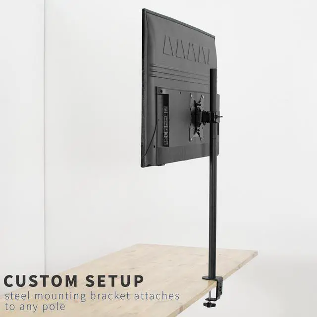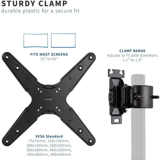 Finding unique screen placement for your TV just got easier with Pole Mount TV Bracket (MOUNT-POLE4) from VIVO! Whether you want to update your current TV stands VESA compatibility or add mounting capability to an existing pole, this sturdy bracket has you covered. It holds one 32 to 55 screen weighing up to 55 lbs with VESA 75x75mm to 400x400mm mounting hole patterns. Fitting pole diameters from 1.1 to 1.9, this durable bracket gives you placement options for the ideal screen location. And thats not all! Once your TV is mounted, the bracket is adjustable for screen leveling and optimal viewing angles. Minimal assembly is required, and the removable VESA plate makes mounting and unmounting your screen a fast and easy process.