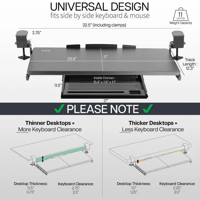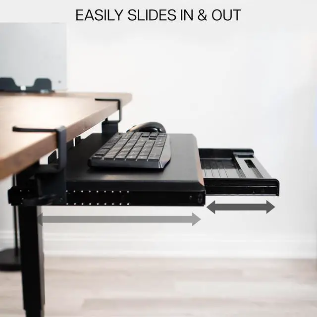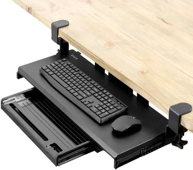 Enjoy the benefits of ergonomic typing angles and a work area that's spacious and organized with Clamp-on Keyboard Tray with Pencil Drawer (MOUNT-KB05-4D) from VIVO! Win back valuable desk space by adding a lower tier surface for the keyboard, mouse, and other small items. Designed with user-geared features such as smooth gliding motion for easy placement, sturdy C-clamps for convenient mounting, and anti-skid padding for scratch resistance, this mount was built to perform! The solid steel track construction makes this mount extra sturdy and guaranteed to last. The under-desk tray placement creates an ergonomic setup that decreases fatigue and muscle strain on the neck, back, and shoulders. The sleek, black appearance adds a classy look to any office while providing ample support for your keyboard and accessories. All hardware is provided for easy installation to get your tray mounted and organized in no time!