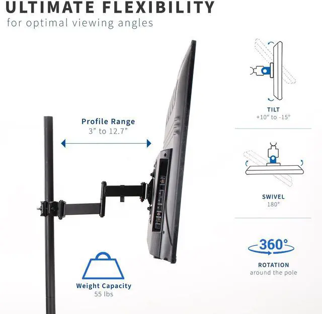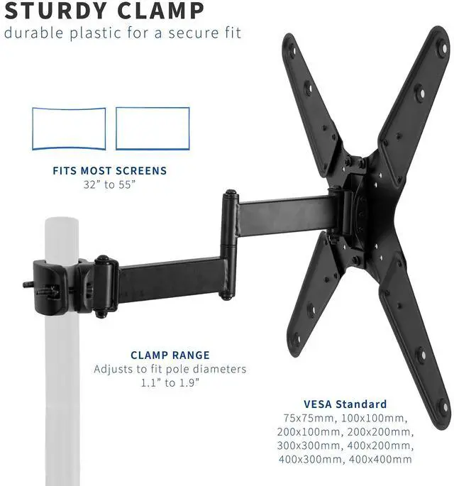 Finding unique screen placement for your TV just got easier with Pole Mount TV Arm (MOUNT-POLE4A) from VIVO! Whether you want to update your current TV stands VESA compatibility or add mounting capability to an existing pole, this sturdy bracket has you covered. It holds one 32 to 55 screen weighing up to 55 lbs with VESA 75x75mm to 400x400mm mounting hole patterns. Fitting pole diameters from 1.1 to 1.9, this durable arm bracket gives you placement options for the ideal screen location. And thats not all! Once your TV is mounted, the bracket is adjustable for screen leveling and optimal viewing angles. Minimal assembly is required, and the removable VESA plate makes mounting and unmounting your screen a fast and easy process.
