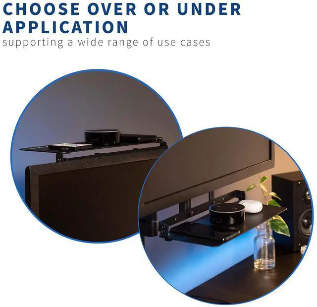 Enhance your visual display with Black Over/Under VESA Monitor Shelf (MOUNT-SF01M) from VIVO! This modern shelving unit is a sturdy, helpful addition to your computer monitor setup, creating convenient storage space over or under your screen. The shelf is capable of holding media devices, controllers, routers, speakers, and more. Solid steel mounting brackets support VESA patterns 75mm, 100mm, and 200mm in width, giving your monitor setup the extra storage space it needs to minimize clutter and promote a clean display.