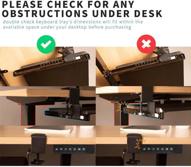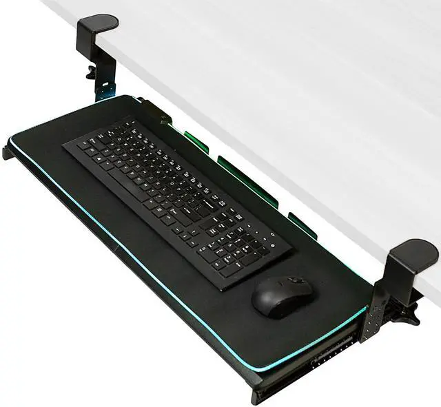 Win back valuable desk space and add RGB flare to your setup with the Black Clamp-on Height Adjustable Keyboard Tray with RGB Pad (MOUNT-KB05GP) from VIVO! Vibrant LED lights line the sides of the mouse pad with 9 powerful RGB colors and customized display settings. Featuring USB connectivity, easily power your LED tray through your laptop, PC, or A/C wall unit (not provided). This stylish LED keyboard tray features smooth gliding tracks for easy movement, 5 height adjustment settings for customizable use, and solid C-clamps with anti-skid padding for damage-free installation. The under-desk tray placement creates an ergonomic setup that decreases fatigue and muscle strain on the neck, back, and shoulders. All hardware is provided for easy installation, so you can get your new tray mounted and enjoy comfortable typing angles in no time!