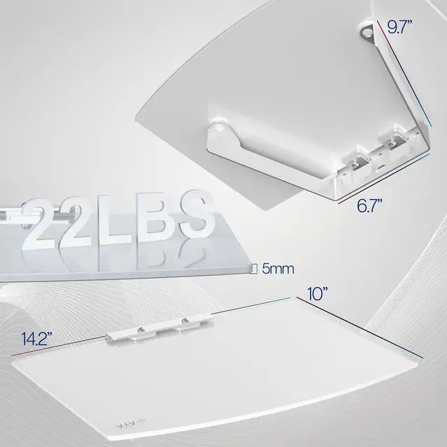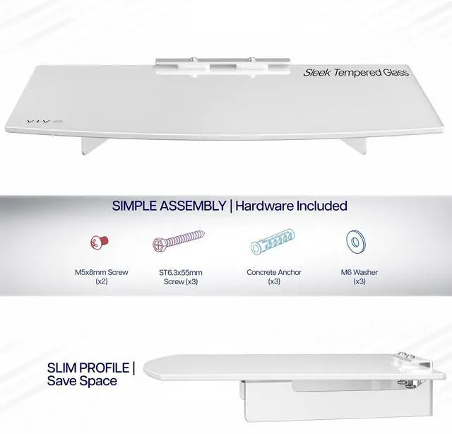 MOUNT-SF011W is a white wall mount shelf, perfect for home entertainment setups. The 14.2" x 10" shelf is made of strong 5mm tempered glass with a weight capacity of 22 lbs. Typically hung beneath TV's, this floating shelf is designed to hold DVD players, streaming devices, gaming devices, audio equipment, and more. The thin profile works very well with ultra-thin flat screen TV's. This is a simple assembly and installation that includes necessary mounting hardware (Not suitable for mounting to drywall alone!).
