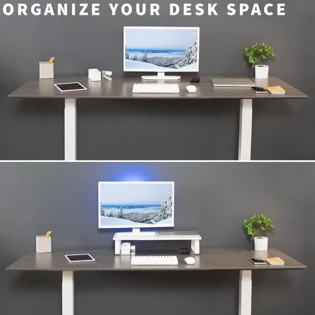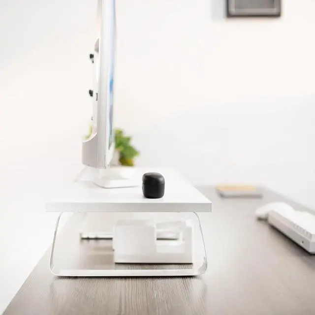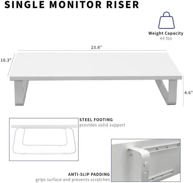 Enjoy ergonomic viewing angles and organized desk space with the White Monitor Riser (STAND-V000D-W) from VIVO! This sturdy, reliable stand keeps your screen at a comfortably elevated angle, and you can enjoy a variety of uses with this versatile product! In addition to holding computer monitors, it can be used to elevate keyboards, laptops, and even small TV's. This stand features a smooth wooden surface that blends well in nearly any environment. The solid steel construction of the footing allows it to support heavier monitors and TVs (up to 44 lbs) while the sleek overall appearance compliments your display and maintains a low profile. All hardware and instructions are provided for easy assembly, so you can get your new stand ready to go in no time!