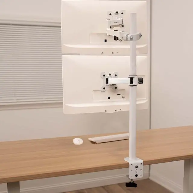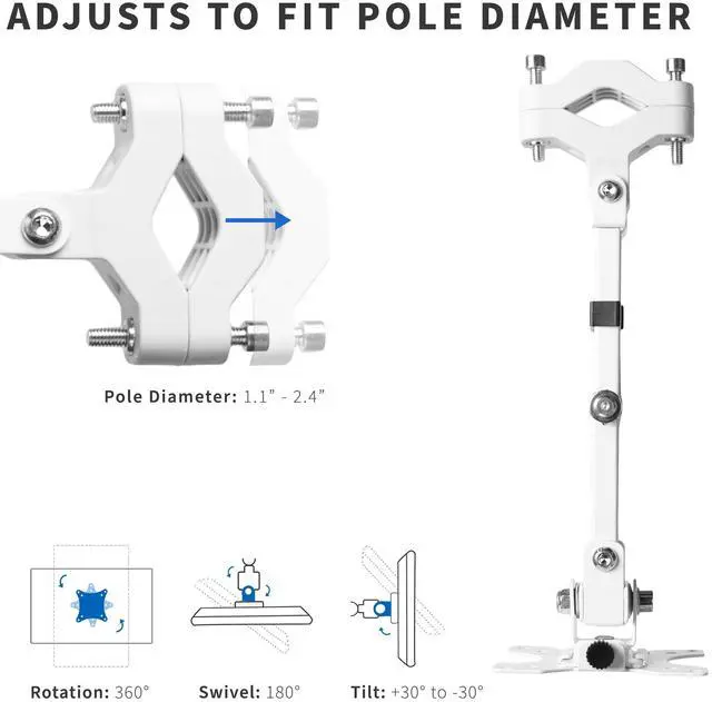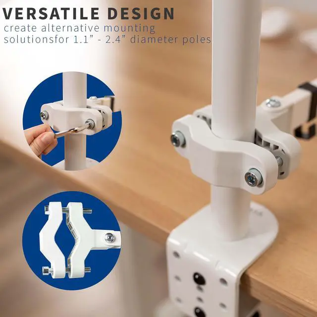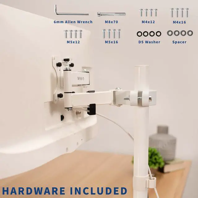 Mounting your monitor or small TV just got easier with White Pole Mount Monitor Arm for VESA 75x75mm and 100x100mm (MOUNT-POLE01AW) from VIVO! Whether you want to update your current monitor stands VESA compatibility or add mounting capability to an existing pole, this sturdy arm has you covered. It holds one 17 to 32 screen weighing up to 17.6 lbs and fits pole diameters from 1.1 to 2.4. Once your screen is mounted, this durable bracket is adjustable with +30° to -30° tilt, 180° swivel, and 360° rotation for comfortable viewing angles that relieve tension on the neck, back, and shoulders. We provide all the necessary hardware for assembly, and a removable VESA plate makes mounting and unmounting your screen a fast and easy process. Please Note: Pole is not included.